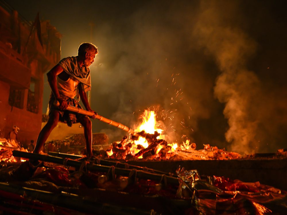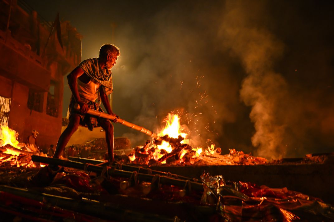 At Varanasi's cremation ghats, the fires burn 24 hours a day. Here, a worker tends to a funeral pyre amidst the heat and smoke. In Hindu belief, cremation in this holy city liberates the soul from the cycle of rebirth, granting 'Moksha' (salvation).