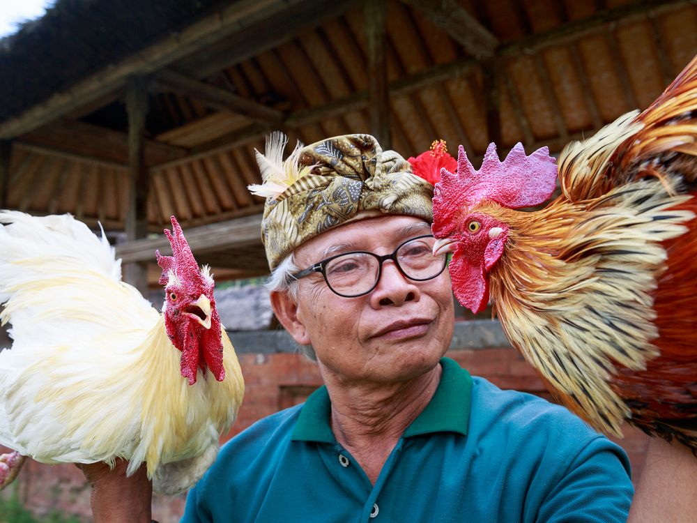 In a small village in Bali, a man proudly poses with his two roosters, which he raises and trains for traditional ceremonies. His calm expression contrasts with the intensity of the animals, reflecting the deep bond between humans and their cultural heritage.