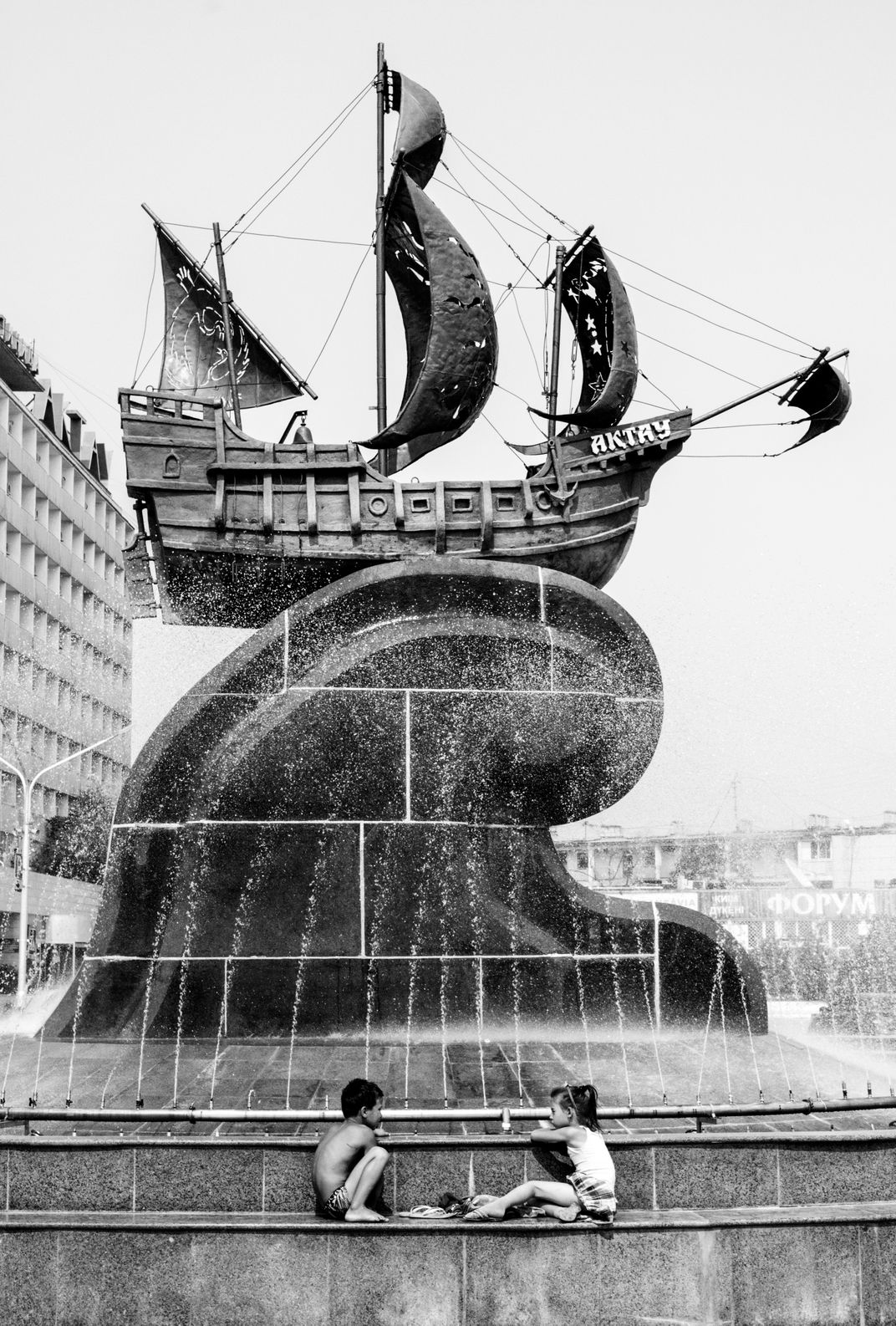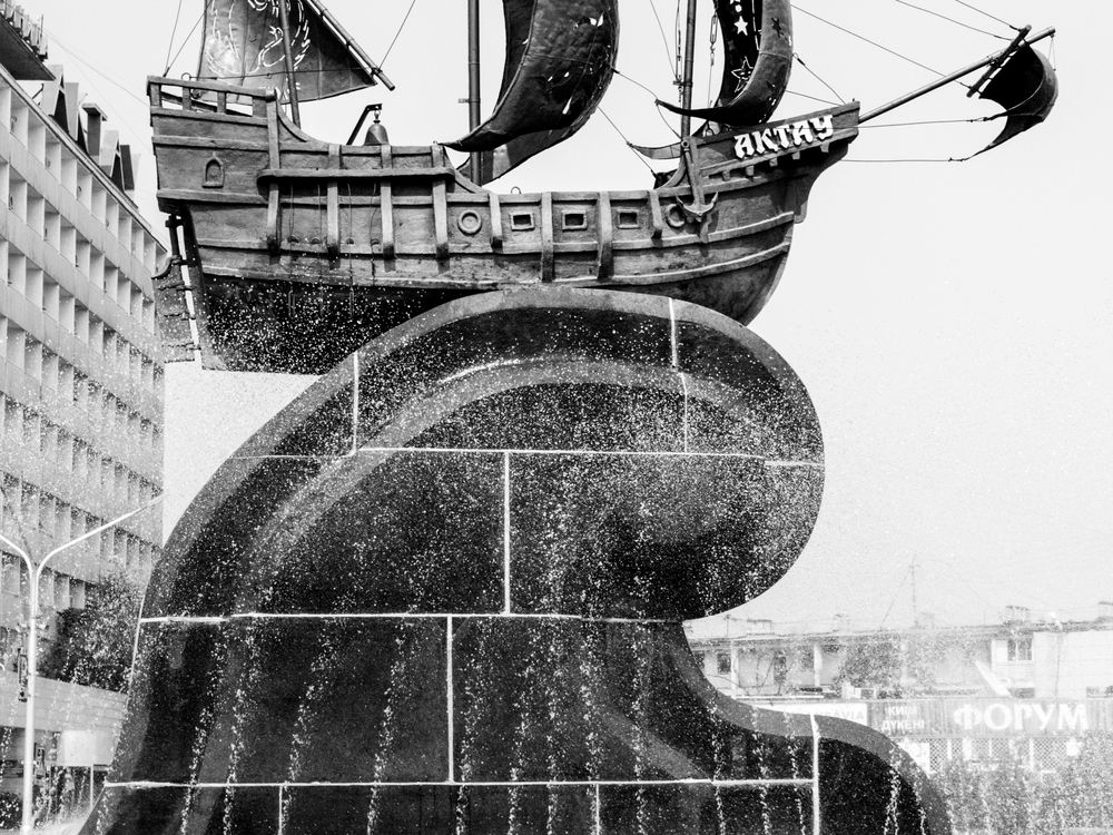 Aktau is very dry and arid city. The only attraction of the city is being close to the sea. Because of its sad grey buildings and its hydrocarbons companies’ headquarters, very few tourists spend their time in this city. My artistic goal was to demonstrate the imaginative power of children and their ability to transform and modulate their environment in order to make it completely magical despite the dismal. The two children were telling a story to each other and seemed to travel, to escape analogically by the boat of the fountain to the extraordinary lands of their imagination.