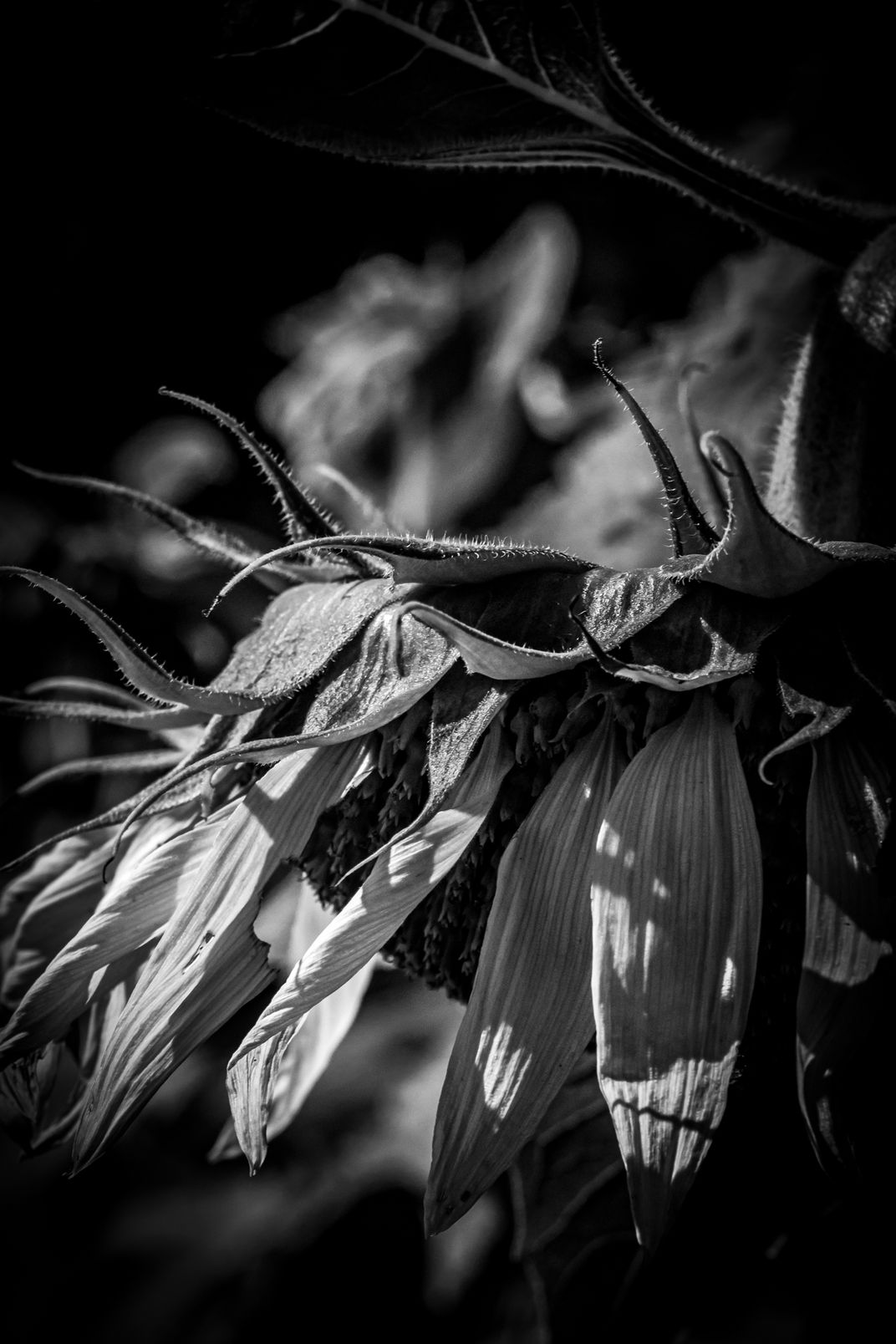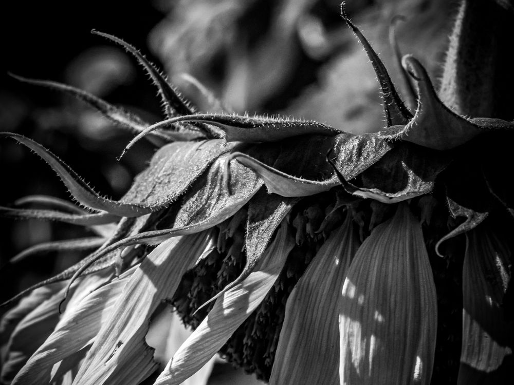A sunflower hangs it's head in defeat as decay overcomes it.