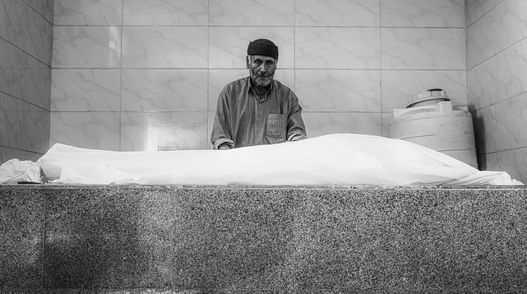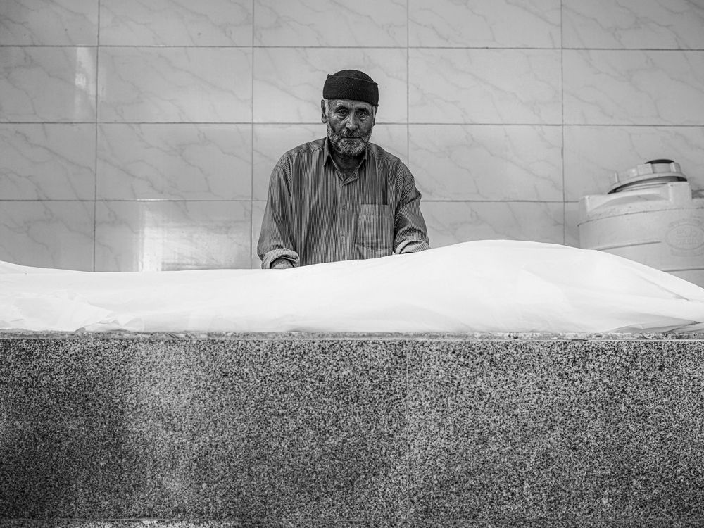 This photo depicts part of a traditional Iranian burial ceremony. The person known as the ghassal (the washer of the dead) first washes the body with clean water and then wraps it in a white shroud called kafan before it is placed in the grave. In this image, you can see the ghassal after washing and wrapping the deceased in the kafan. This is the last time the dead is seen before being laid to rest in the earth.