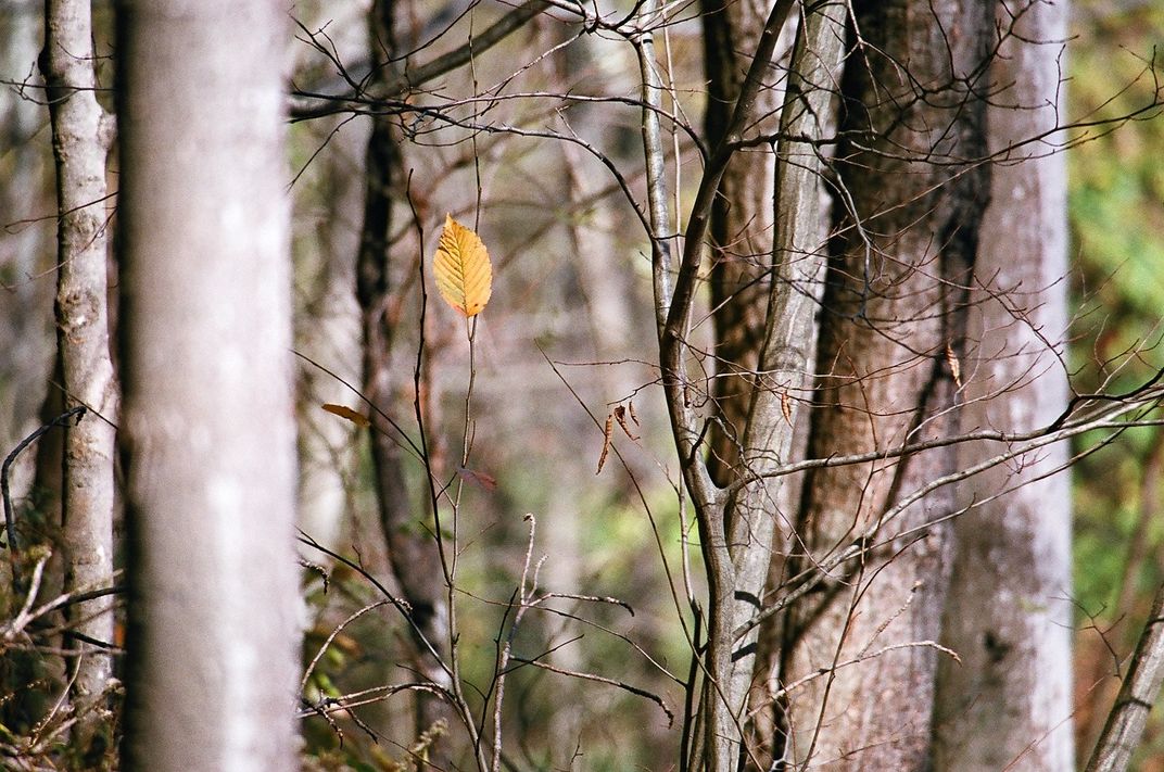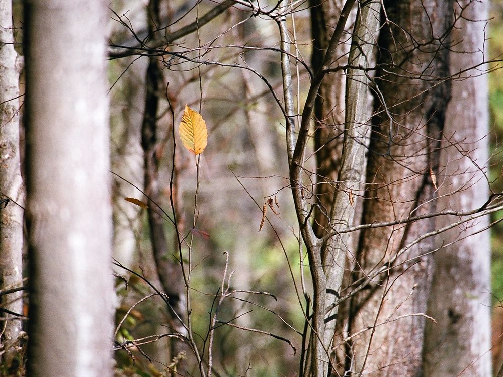 The last golden leaf of fall remains in a bare forest in the Catskill Mountains.