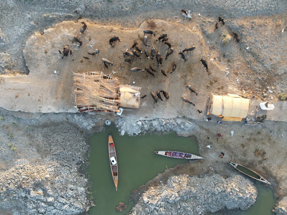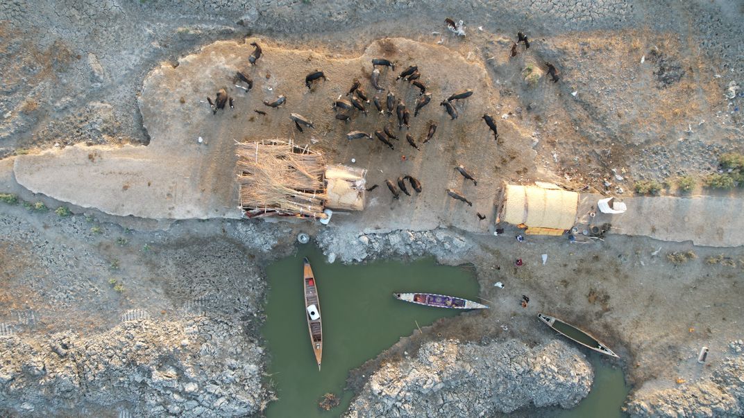 A few shallow pools remain, surrounded by endless cracks. Reflections of the sky in the water create an illusion of life — a poetic image of hope fading but not yet lost.