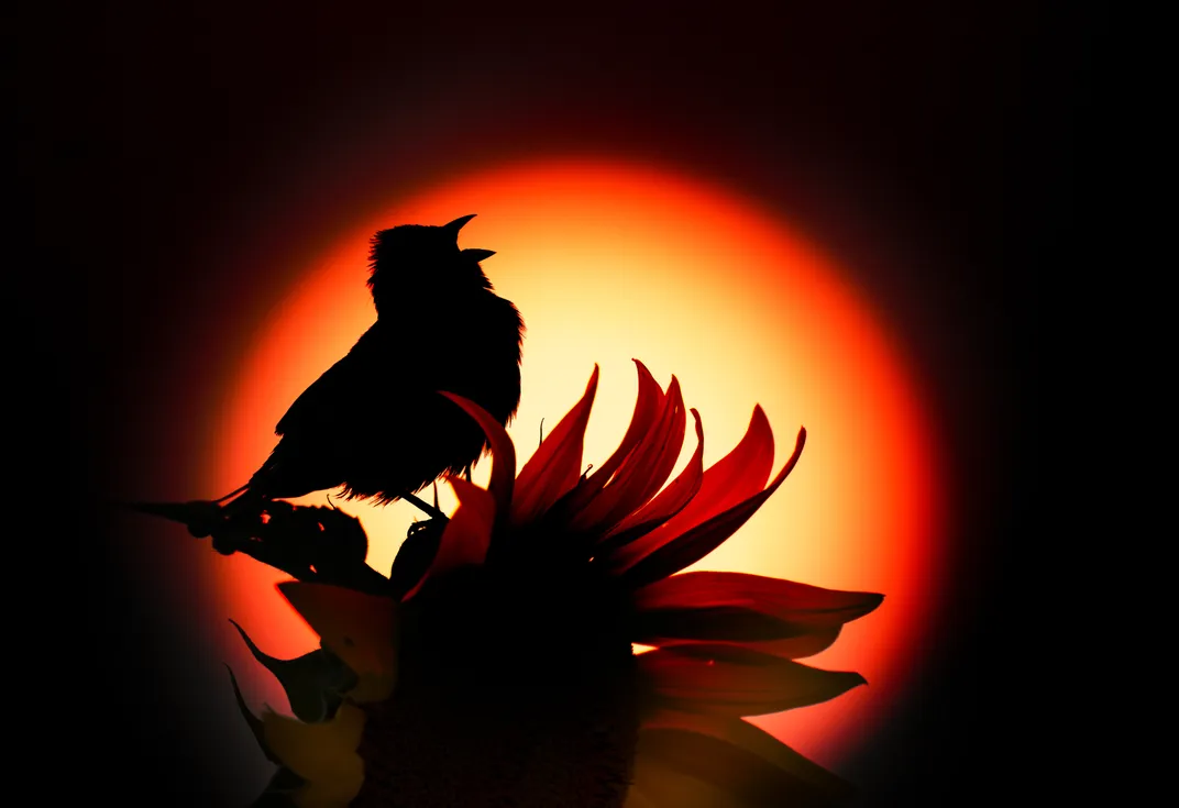 As the sun, a blazing sphere of orange and gold, dips below the horizon, a song bird offers its evening benediction. Captured in perfect silhouette upon the sturdy crown of a sunflower, the bird seems to pour its very soul into the twilight. This image is a celebration of resilience and the powerful, elemental bond between earth, light, and life in the final moments of day.