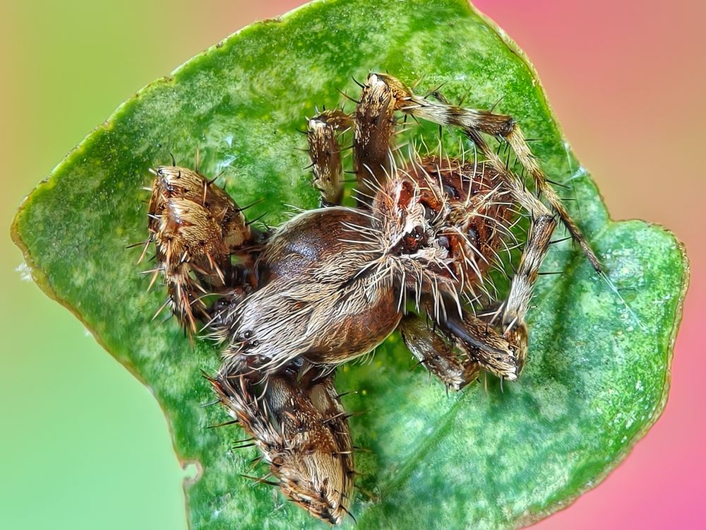 Clinging tightly to the curve of a leaf, this small orb-weaver (Neoscona punctigera) exhibits the cryptic resting posture typical of the species during daylight hours. Equipped with dense spination along the legs and carapace, the spider’s morphology provides both camouflage and structural support for capturing prey. Although diurnally concealed, N. punctigera becomes an active nocturnal hunter by constructing and occupying a vertical orb web where it relies on the bright, contrasting ventral spots of its abdomen as visual lures for phototactic insects. This combination of daytime crypsis and nighttime signal-based predation reflects the species’ finely tuned behavioural ecology and its adaptation to the dynamic rhythms of its environment.