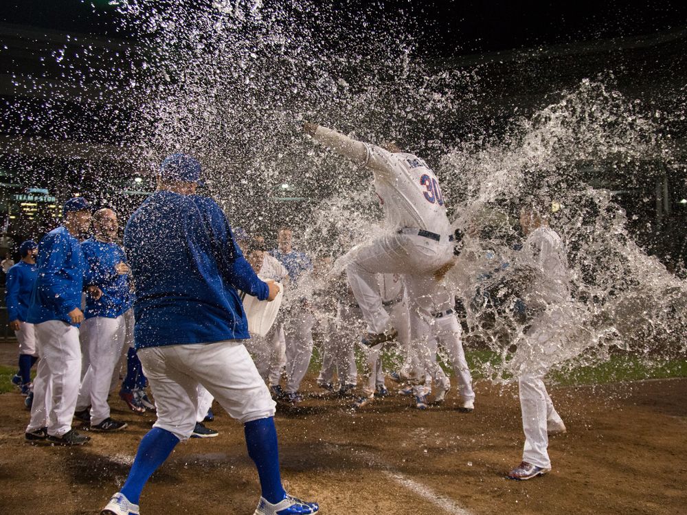 The celebration of a walk-off win baseball is always exciting. Here the Rockland Boulders celebrate a walk-off HR by Mikael Mogues as he leaps up in the air, about to cross the plate.