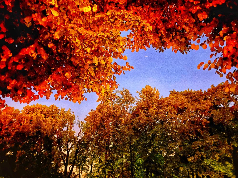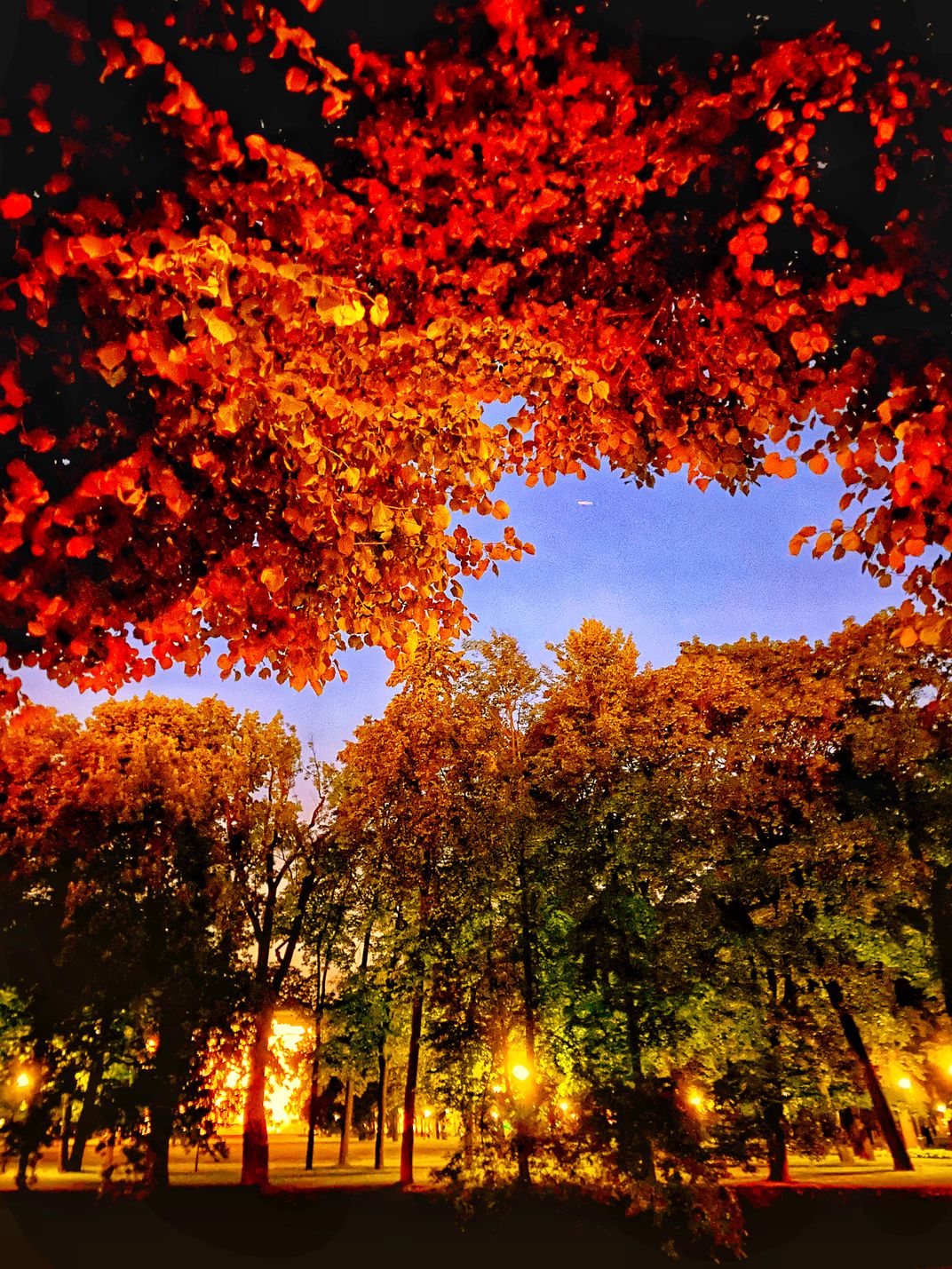 It was a summer day. Because of the light of the lanterns, the leaves were colored in different colors: yellow, red, green. The photo looks like autumn, but in fact it's just a photo processing game.