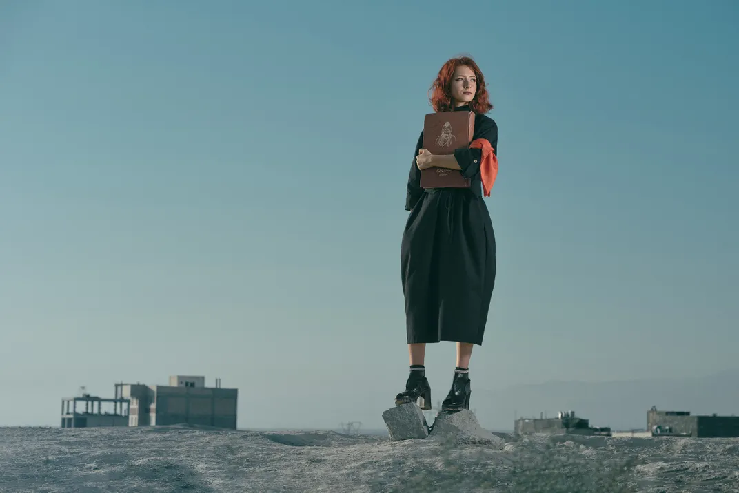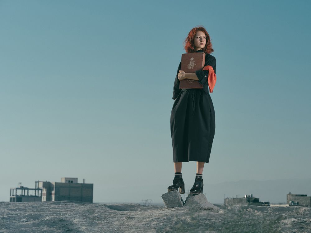 A girl on top of a hill that dominates the city ,with open, orange hair, an orange bracelet on her arm, and a book by the great Iranian mystic and poet Rumi in her hand. This photo dates back to the era after the "Woman Life Freedom" Movement, is a story of the power and current status of Iranian women who have somehow gained control over the city and urban life. They owe this control to the struggle, intelligence, art, and power that they have inherited from the past, myths, and celebrities of Iran. An exemplary courage that has now made them the kings of the city.