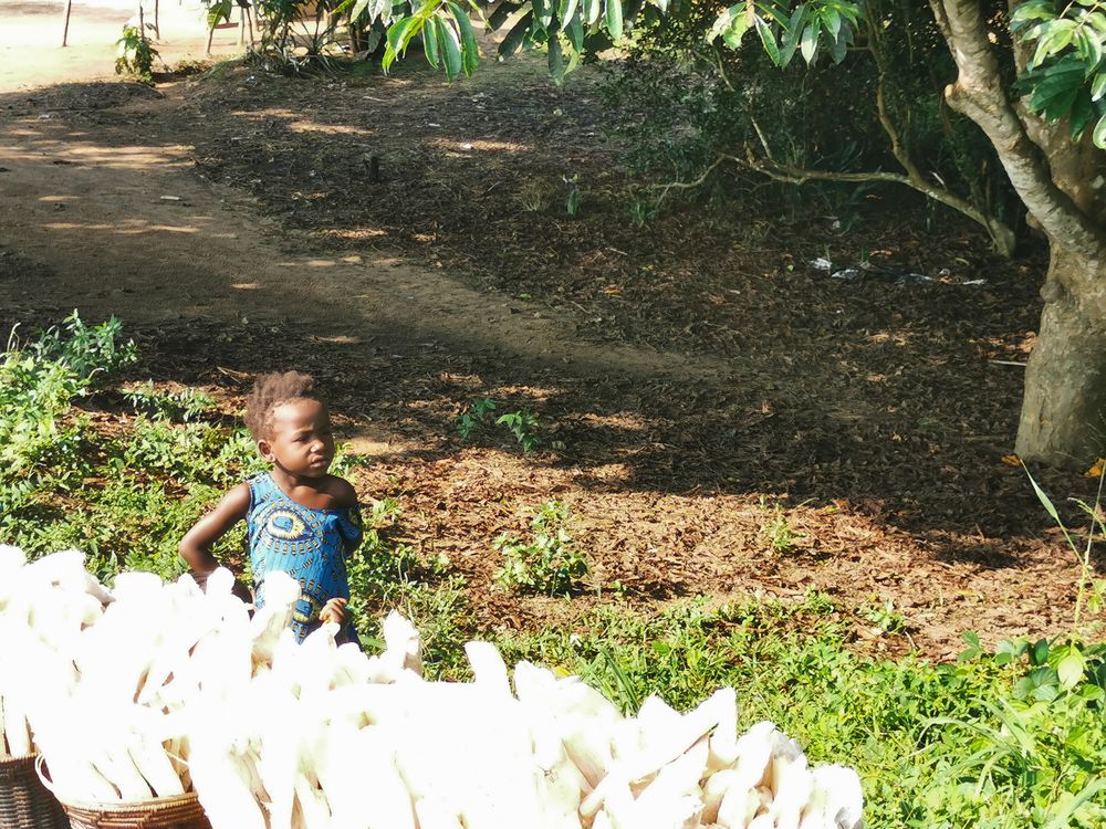 By a rural roadside in Gamboma, Congo, a tiny child tends to his family’s cassava stall—roots stacked on a simple wooden table. The scene captures the gentle resilience of childhood here: young hands caring for what matters, even at an early age.