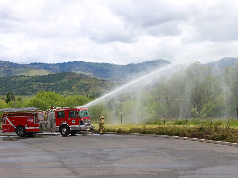 The local Phoenix Oregon fire fighters test the water pressure of the fire truck hoses, they are heroes who protect this beautiful valley.