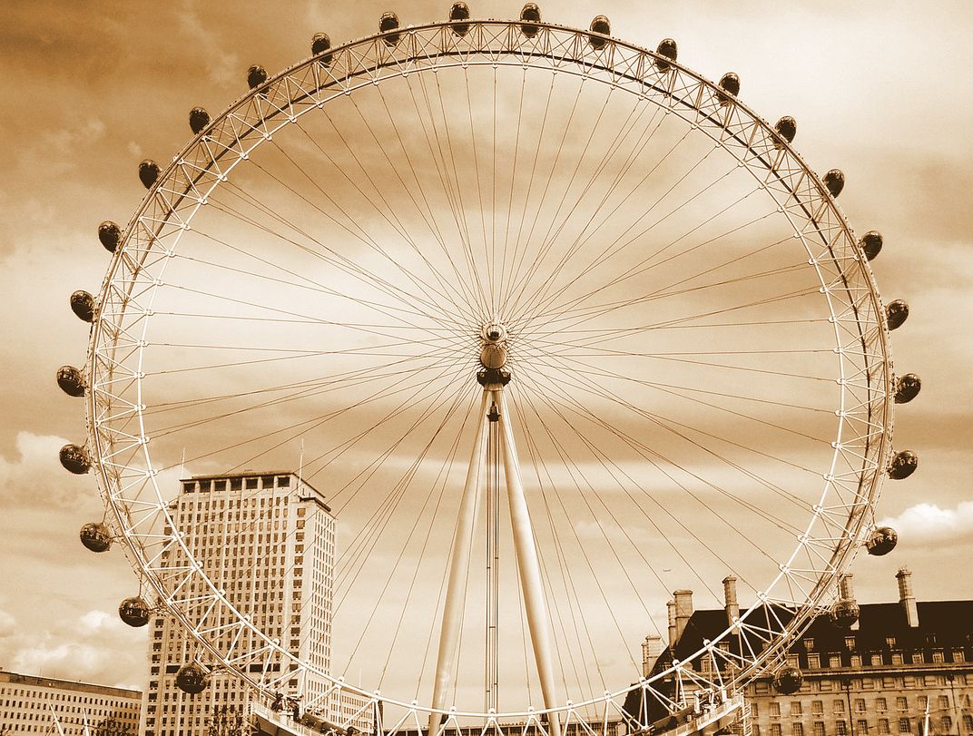The London Eye as seen from a boat ride on the River Thames.