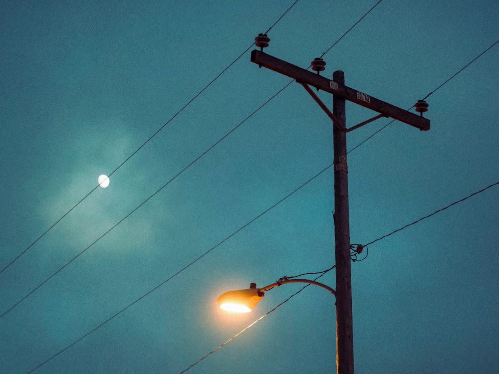 A reflective image of a calm night. As if the telephone pole and moon are somehow communicating.