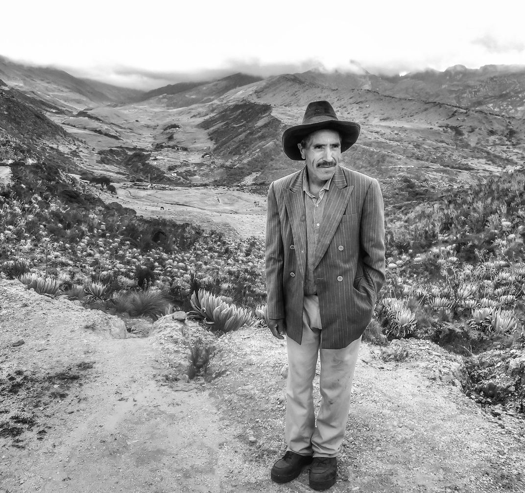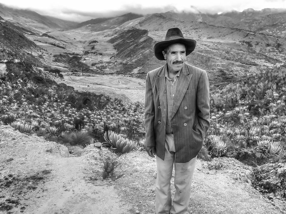 Portrait of an inhabitant of the Andean highlands of Mérida state in Venezuela, the character poses in front of the Valley called Cañada de Las González in the Sierra de La Culata National Park.