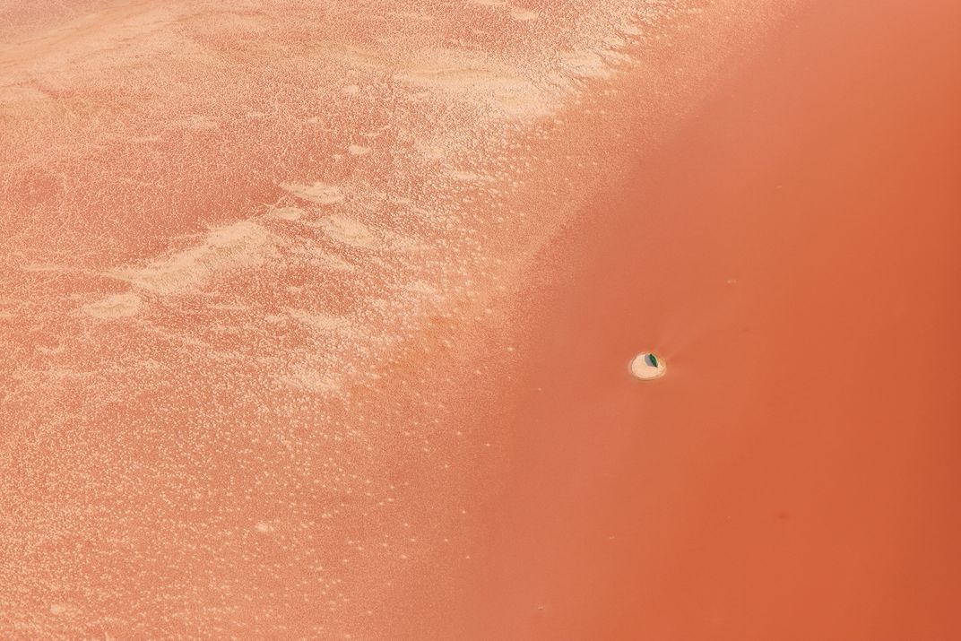 n the Great Salt Lake, an overturned boat rests on a small patch of exposed salt, surrounded by water stained by extreme salinity and microbial blooms. The boat now sits immobile in a landscape where water no longer behaves as it once did. Photographed from above, the scene reduces the lake to color and form — a quiet marker of a system pushed past its natural rhythms, and the fading memory of a place once navigable.