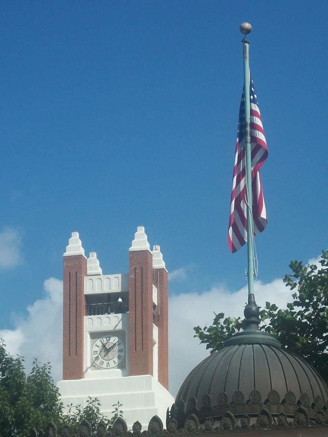 This photo was taken from the Oskaloosa Square and shows the top of Oskaloosas historic bandstand as well as the top of the Mahaska County Courthouse.