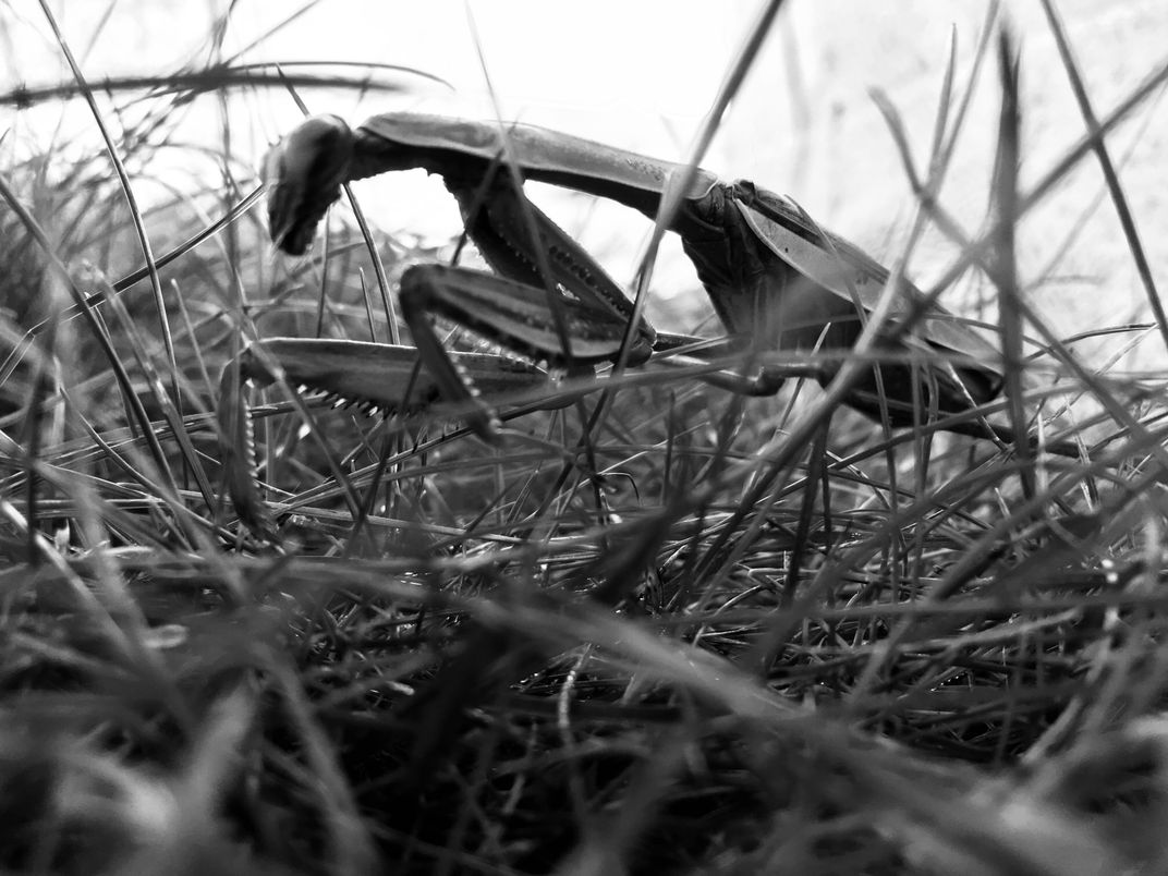 I was imagining traveling back in time to a place where a giant Praying Mantis was walking among dinosaurs.
