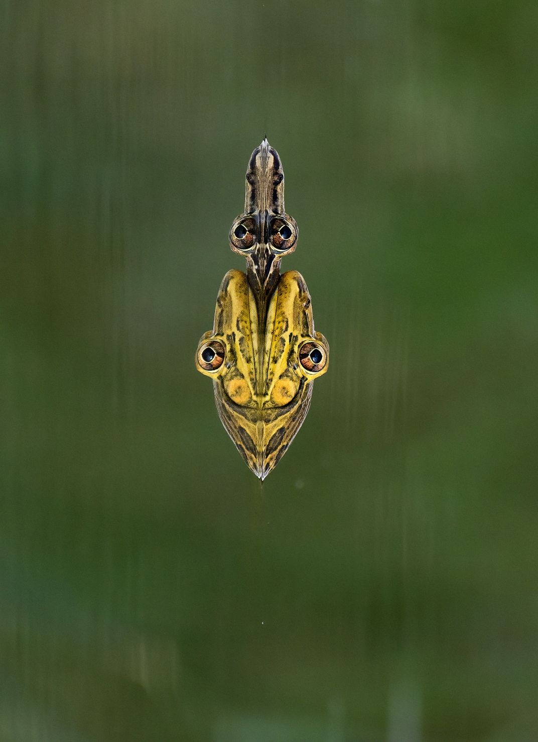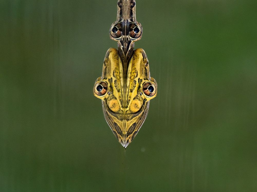 What appears at first glance to be a tribal mask or a pair of mysterious human faces is, in truth, nature’s illusion—two Indian bullfrogs mating, captured & rotated. This creative twist on perspective reveals how life, love, and art often intersect in the most unexpected ways.