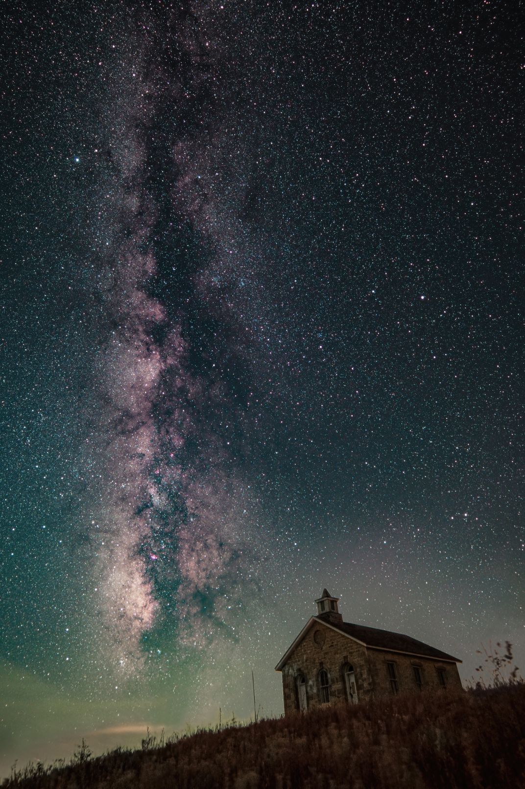 This is the fall Milky Way hovering over the historic Lower Fox Creek Schoolhouse on the Tallgrass Prairie National Preserve in Kansas. It was a clear night with no moon, and the Milky Way was clearly visible to the naked eye.