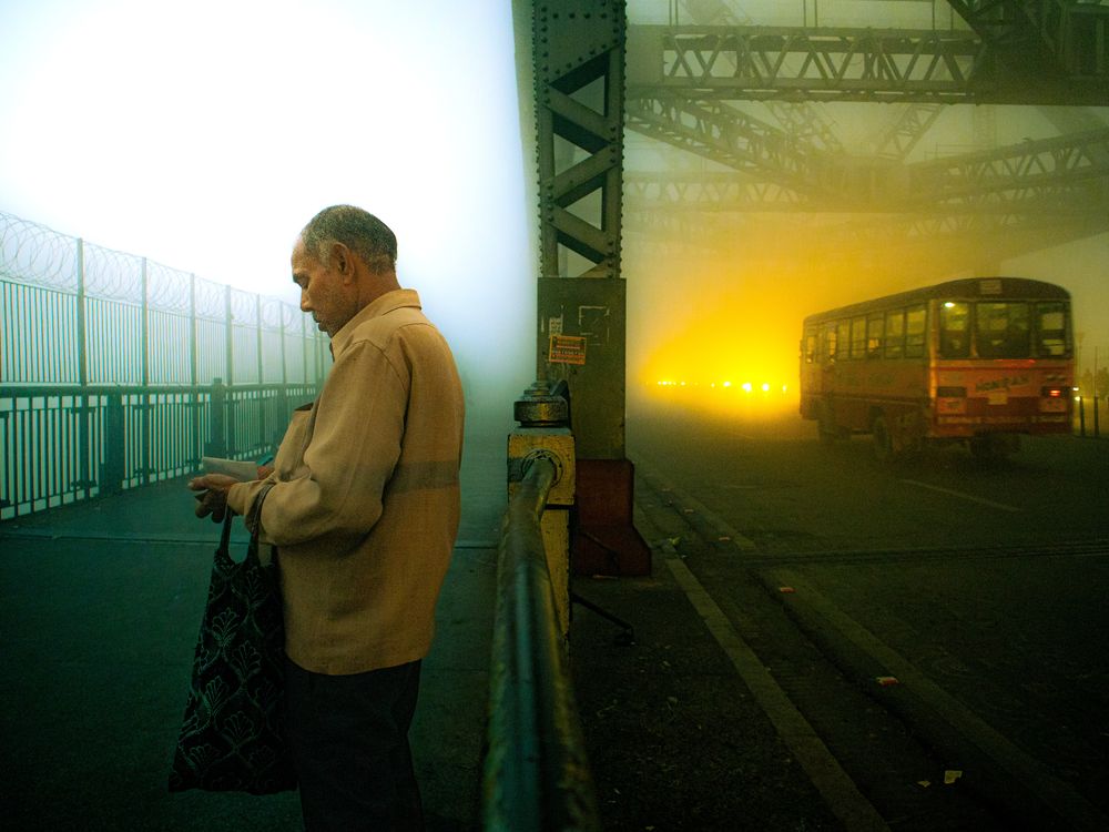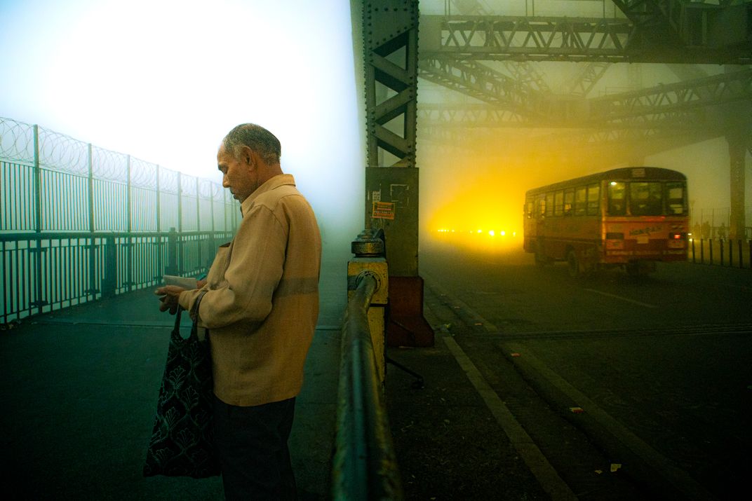 Wrapped in fog and fleeting light, an elder waits as the bus emerges from the mist, while checking for change in his pocket he misses the bus.