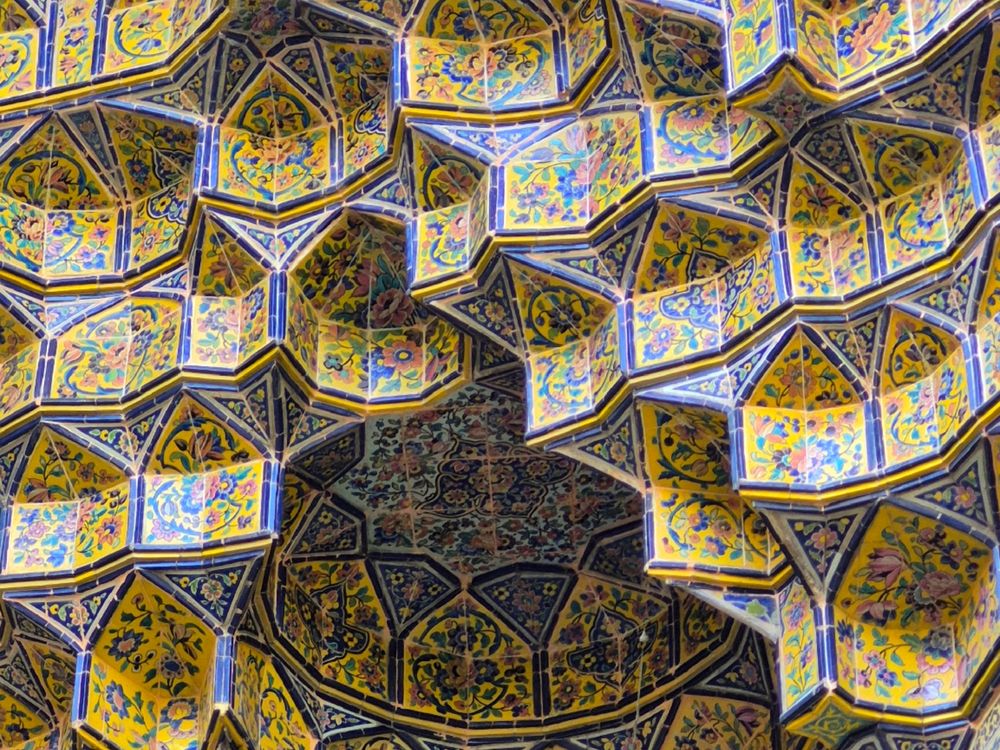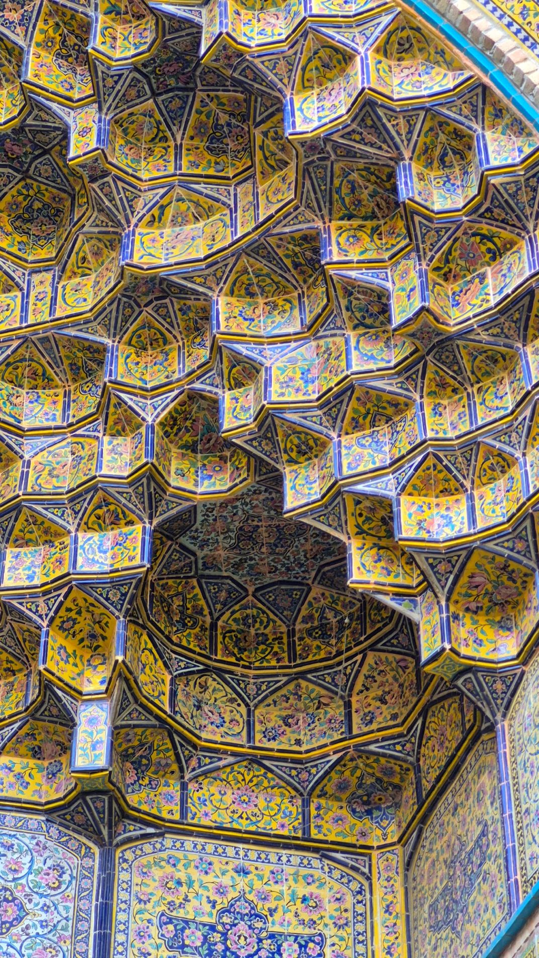 a breathtaking muqarnas—an intricate, three-dimensional vaulting element in Islamic architecture—bursting with vibrant hues of yellow, blue, and pink. The honeycomb-like structure is adorned with delicate floral and arabesque motifs, creating a mesmerizing tapestry of geometry and ornamentation. Rich in symmetry and craftsmanship, it evokes a celestial atmosphere, where architecture becomes a poetic reflection of the heavens.