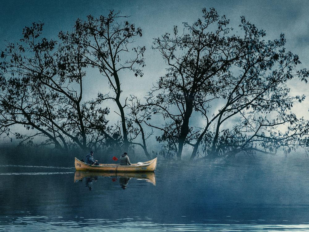 This is a collage of 2 photos. One is the reflections of tree branches in water, the other is two men in a boat. The goal is to create a mystical atmosphere with large tree branches coming directly out of the water and light behind the branches.