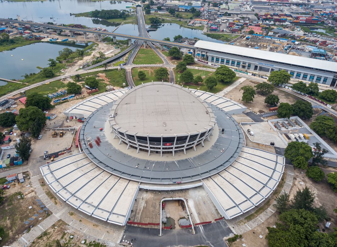 This is a shot of the National Arts Theater Lagos Nigeria. The theatre was built to look like a military hat. The designed was burrowed from Eastern Europe.