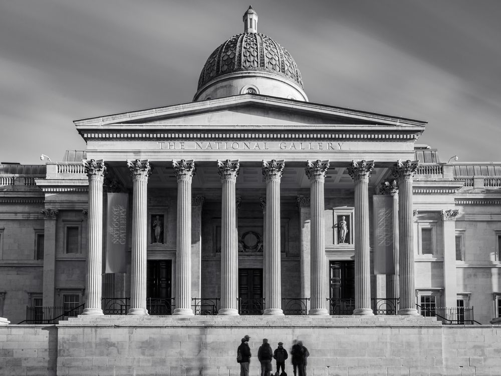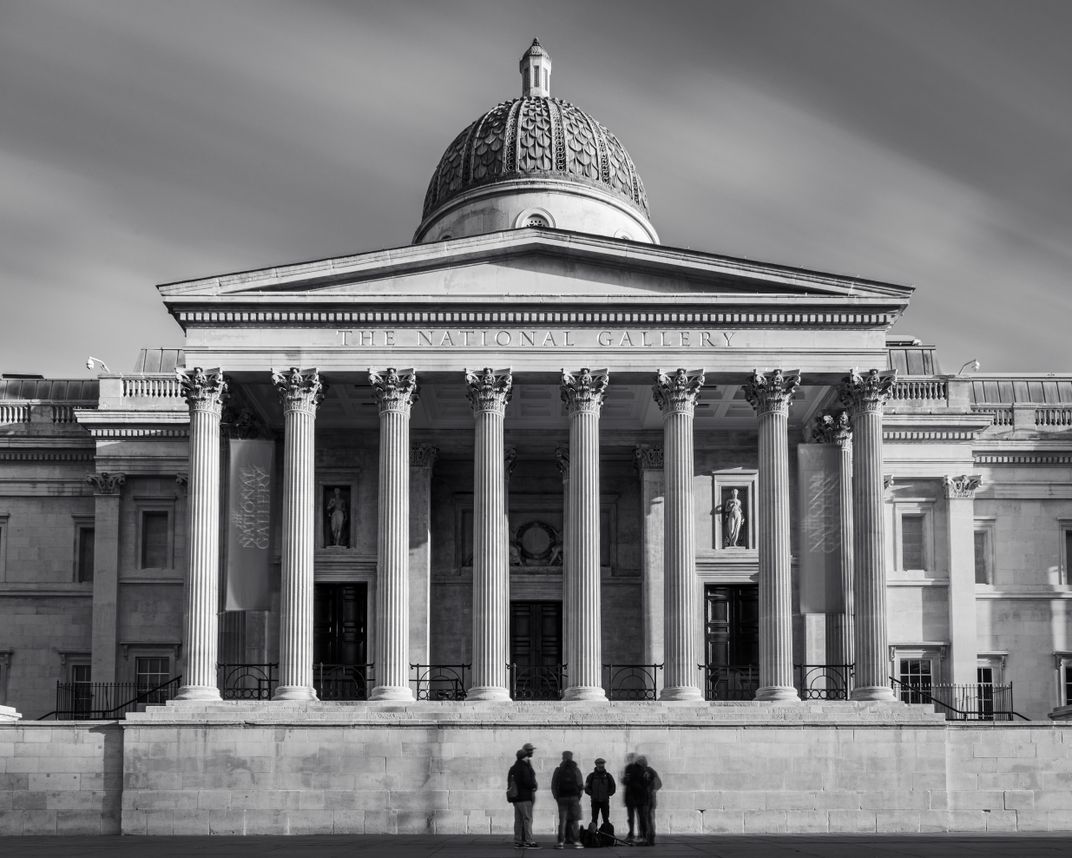 Organizers stand in front of The National Gallery in London, England. The gallery is situated in Trafalgar Square in the City of Westminster and was founded in 1824.