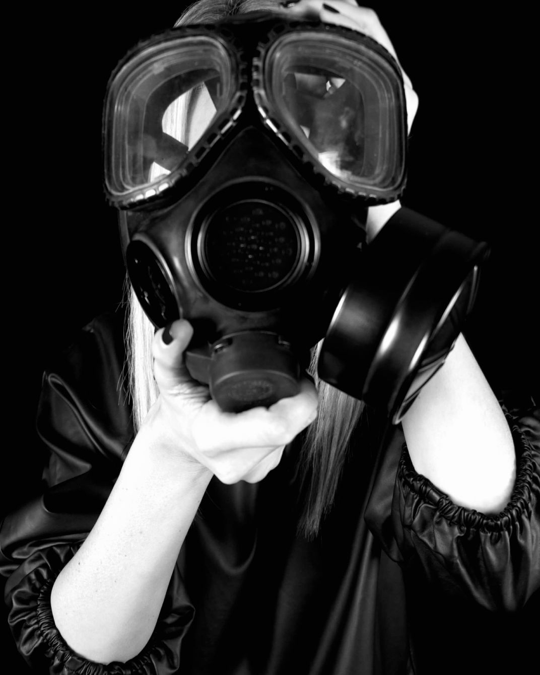Portrait with a gas mask, the COVID-19 years. Black and white.