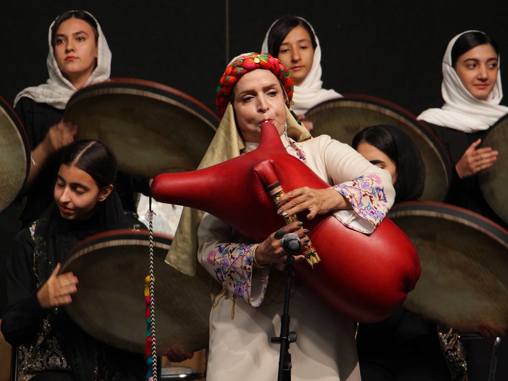 The authentic Iranian instrument, the Ney Anban, stands out with its red color among the female daf players. An instrument that recalls the sound of the Persian Gulf.