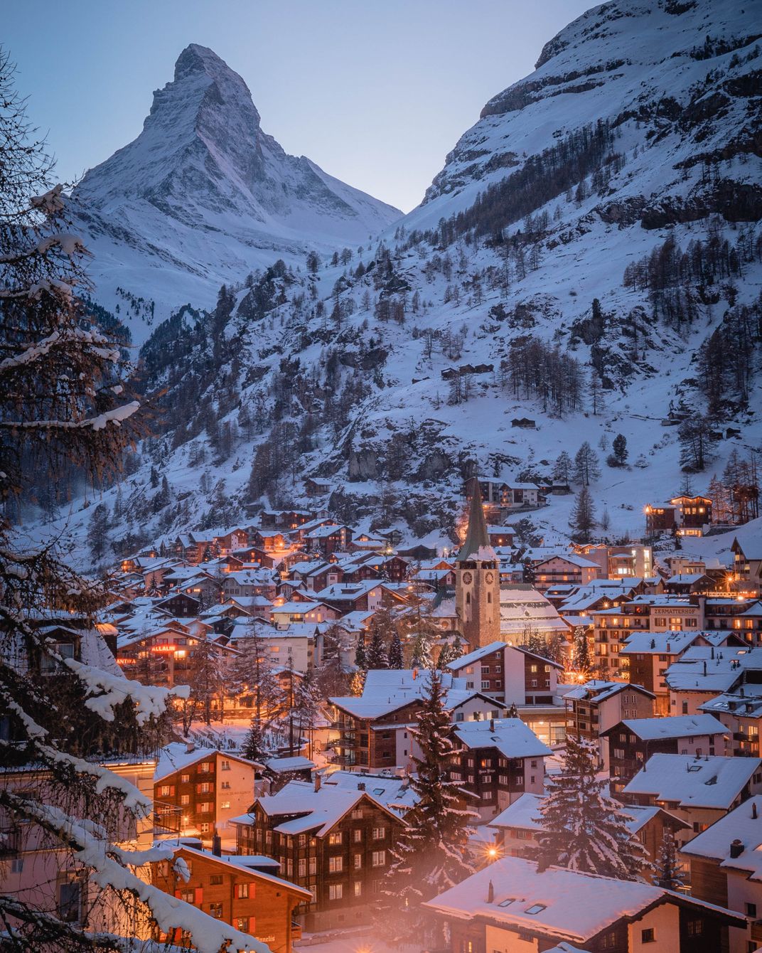 Zermatt is known for its iconic mount, Matterhorn, with a triangle appearance. Each year, it attracts thousands of tourists to visit ski resorts. During snow days, All the roofs have a layer of snow looking pretty warm and dreamy. As the day faded into twilight, numerous lights lit up the mount with the small village in the background. The breathtaking scene made me overwhelmed and amazed, and I could not help but take several pics as my souvenir of this priceless journey in Zermatt, and this is one of them.