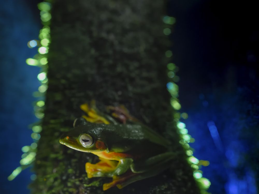 Perched on a moss-covered tree trunk, a frog clings tightly under the cover of night. Its vivid green and orange hues stand out against the deep blues and blacks of the forest backdrop, glowing softly under the carefully placed light. The scene captures a fleeting moment of stillness, where the frog seems to blend into the mystery of its surroundings while remaining the focal point of the image.