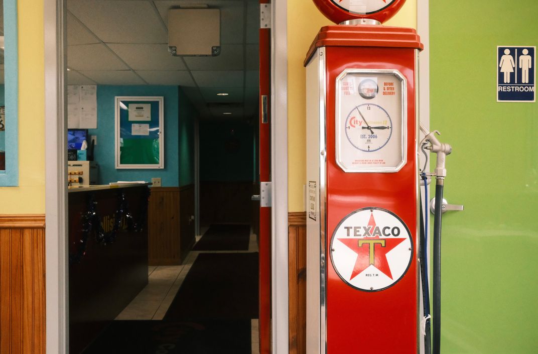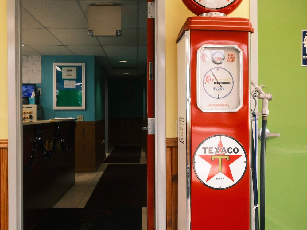 This image shows a car wash lobby with a retro-themed interior. It challenged the concept of time and trends within the American society.