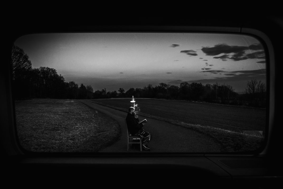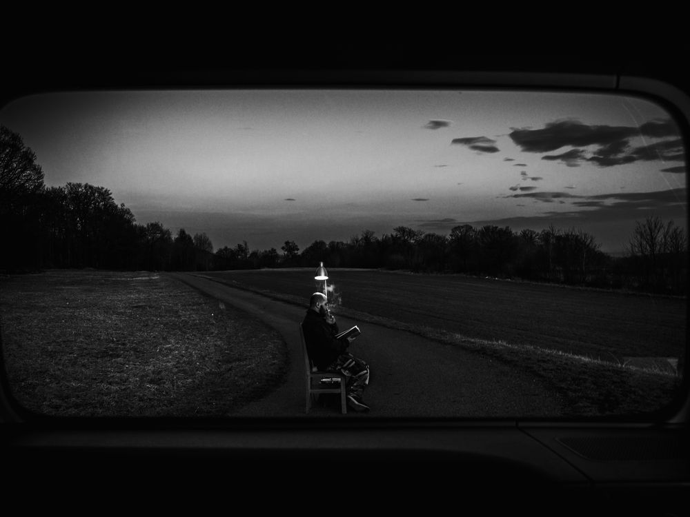 A lone figure sits on a rural path beneath a single lamp, reading and smoking in the fading evening light. Framed through the car window, the moment appears calm yet slightly surreal, as if the observer and the observed merge.