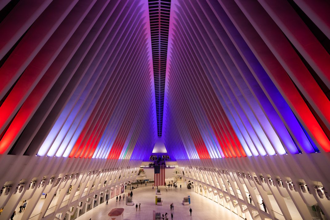 The Oculus at the World Trade Center in New York, lit up at night in red white and blue, commemorating the anniversary of 9/11.