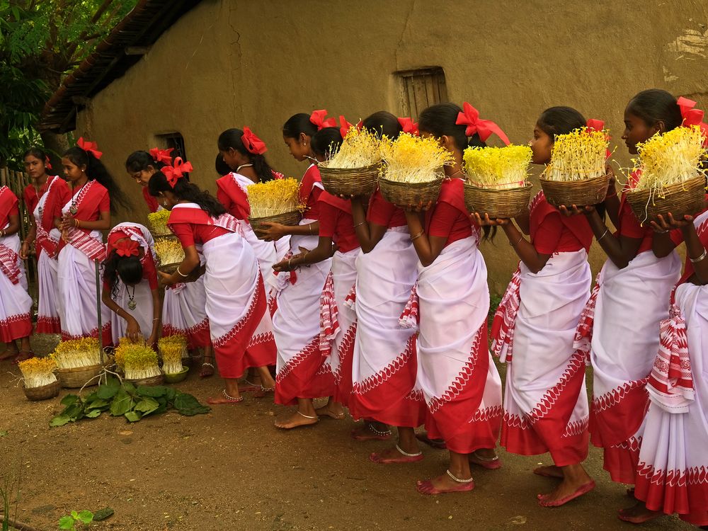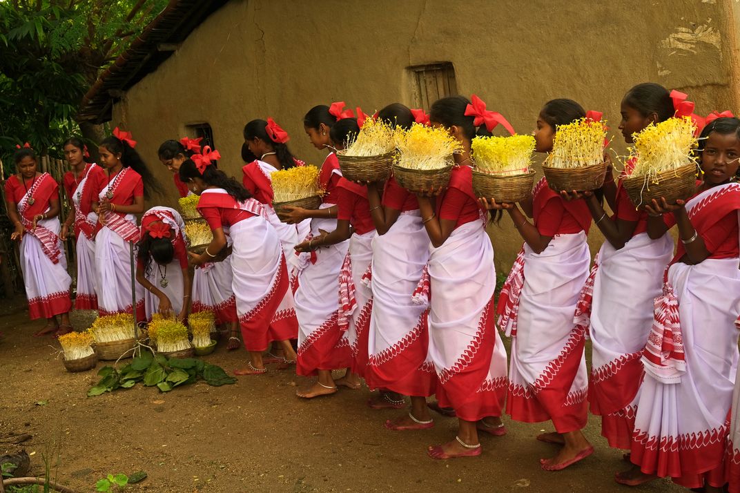 Girls of a tribal village are seen with baskets of sprouts in their hands during a local festival in West Bengal.