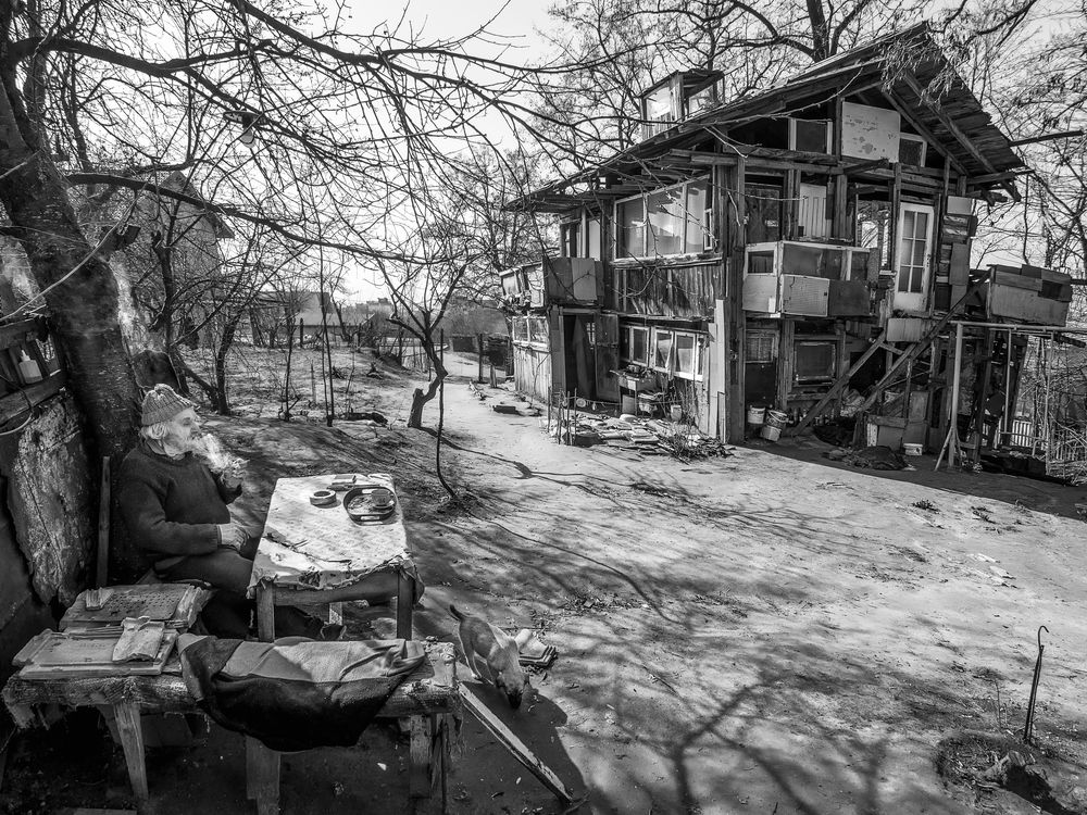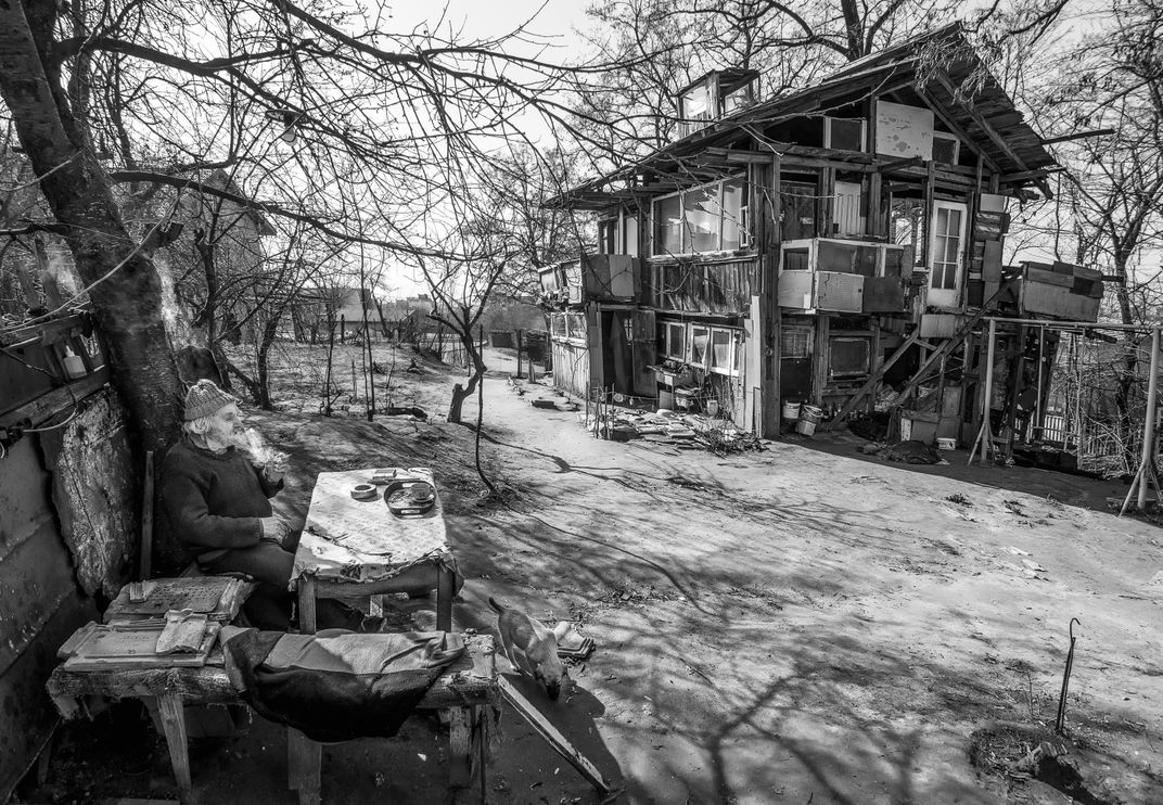 The old man smoking in his yard with the unique house which was build by him