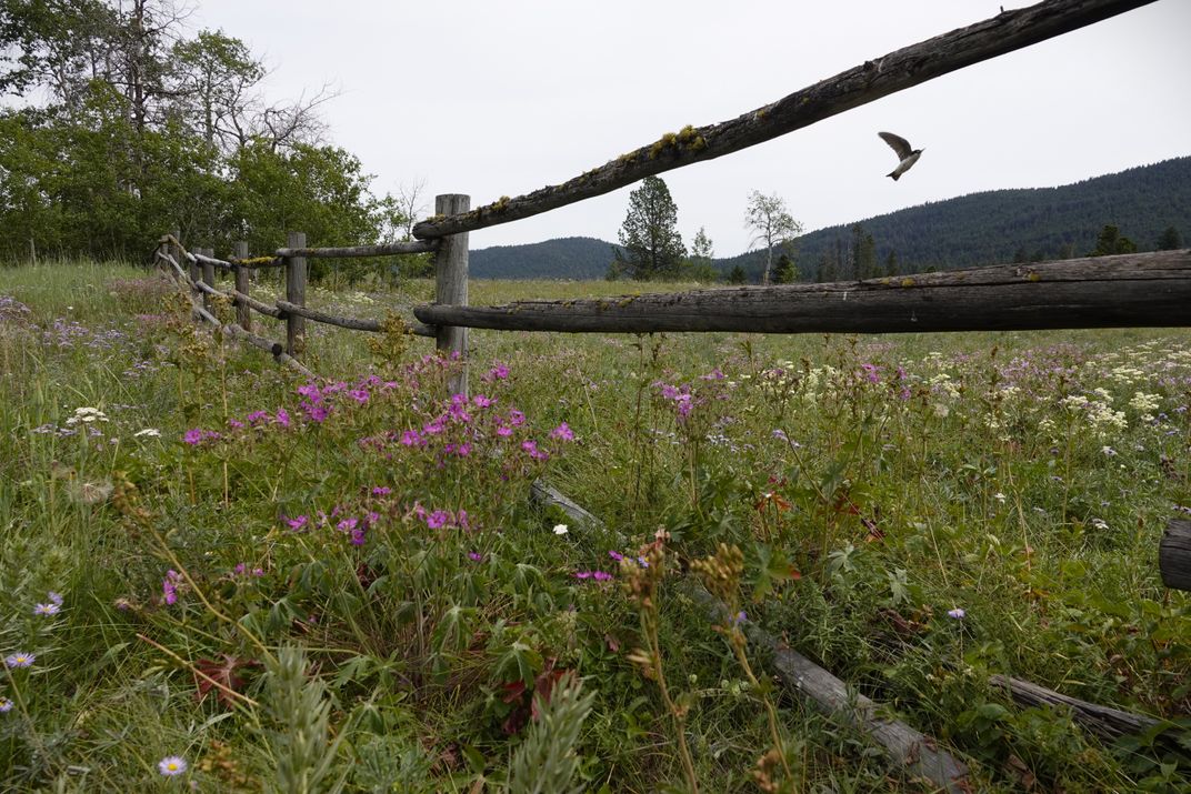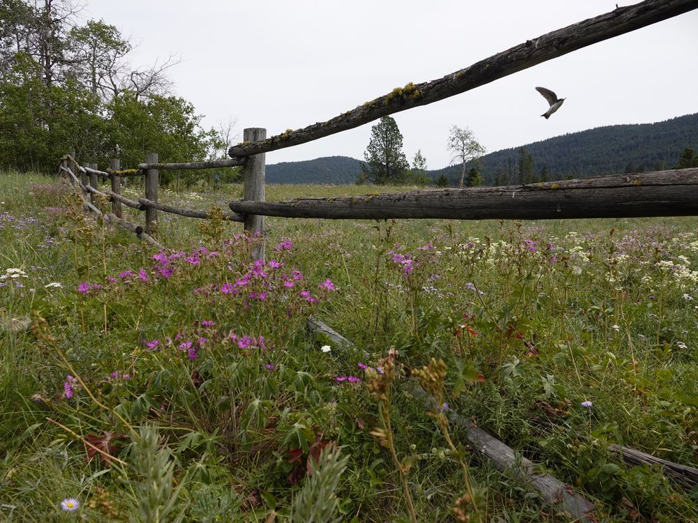 We were exploring some back roads in central British Columbia. It was just at the beginning of July and the wild flowers were spectacular. I really like rail fences and when I saw this scene, I had to take a few pictures. The bird decided to photo bomb this shot, and I liked the addition of the bird.