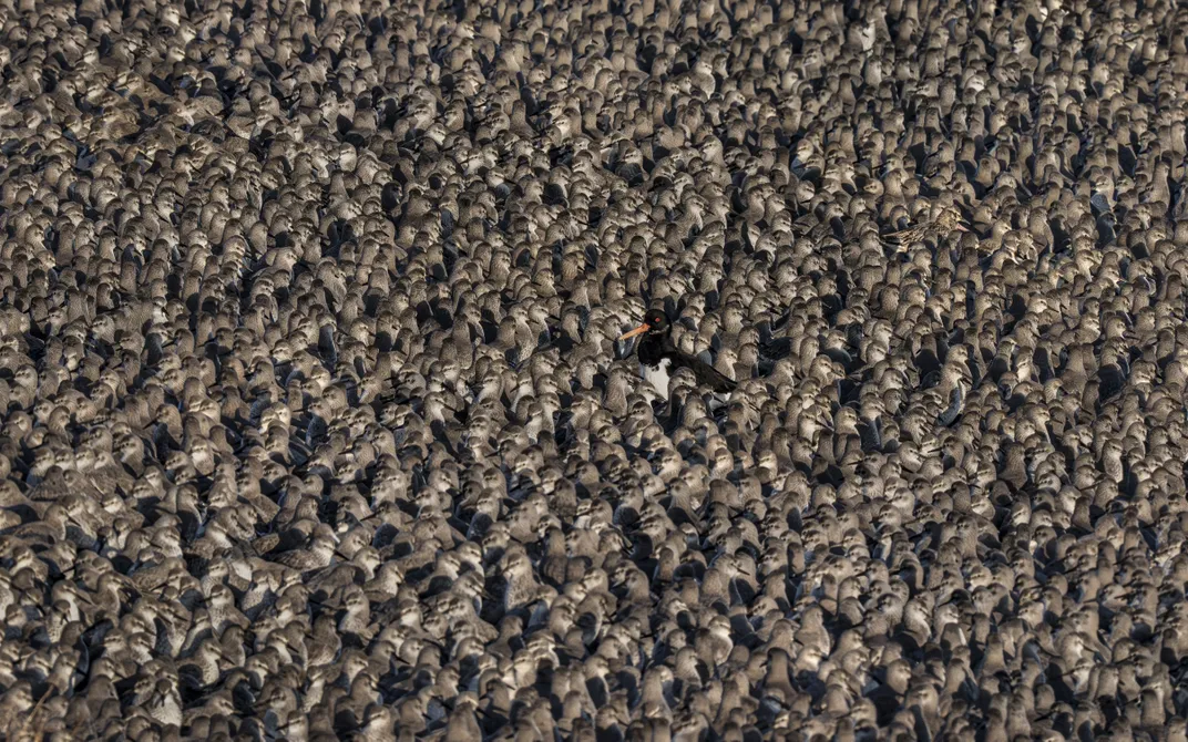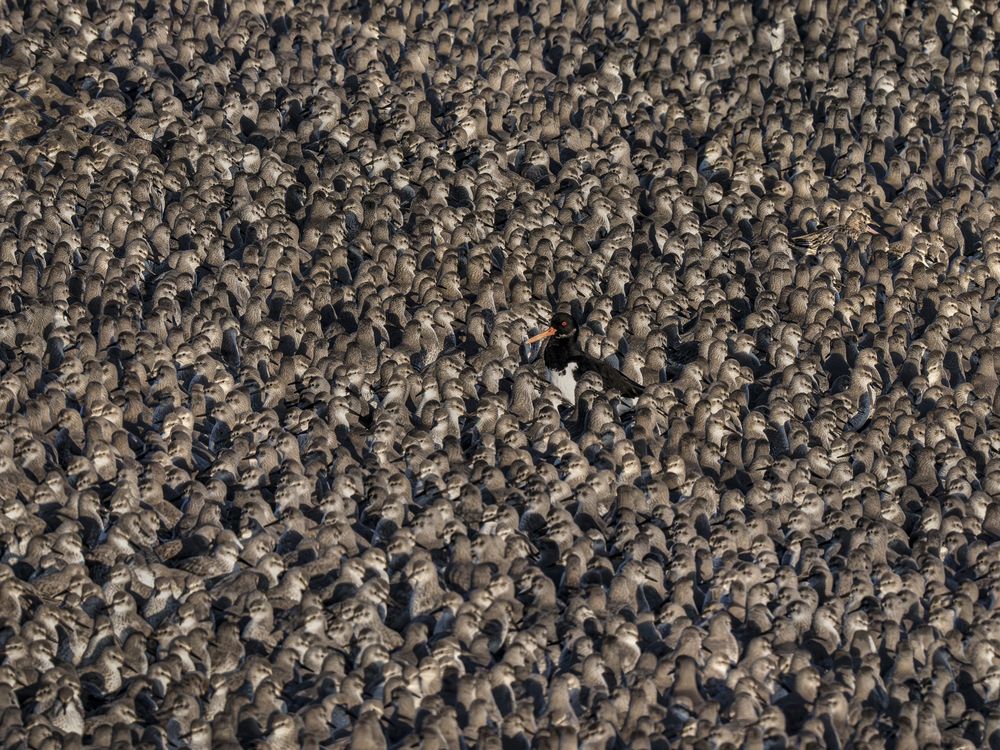 During the Snettisham Wader Spectacle, a lone Oystercatcher stands out amid thousands of tightly packed knots. From this perspective, the flock becomes a living pattern, revealing a rare moment of contrast in a sea of movement.