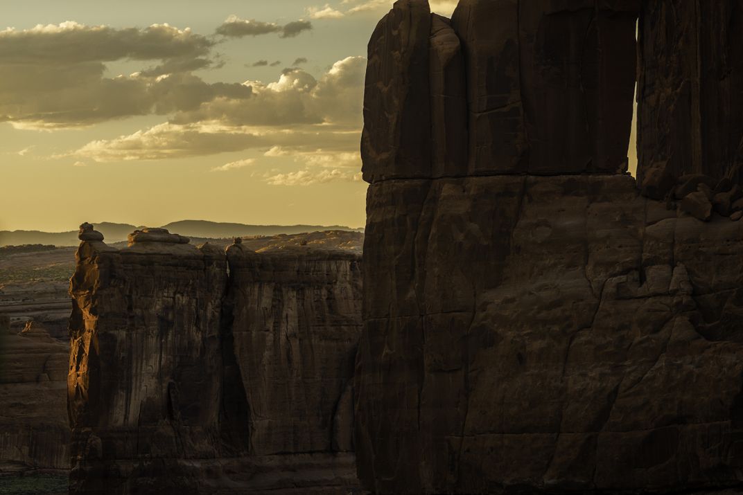 "The Organ," photographed from the Park Avenue trail head in Arches National Park at sunset.
