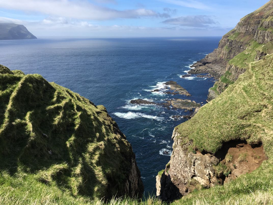 Looking toward the island of Mykines, the rippled natural terraced cliffs made for interesting textures. The nearly lenticular clouds reflecting on the sea contrasted with the jagged cliffs, as well.