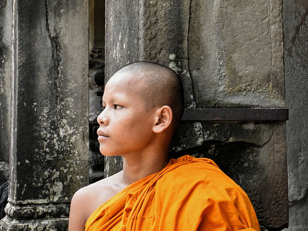 As the other monks pray nearby, this monk sits next to a column, and is somber in thought.