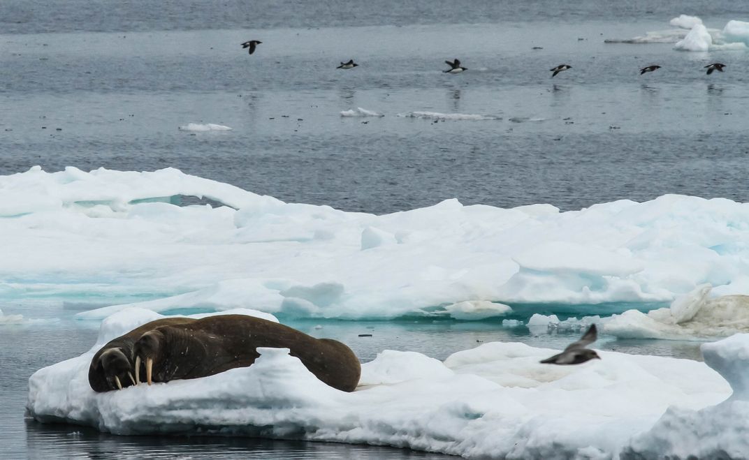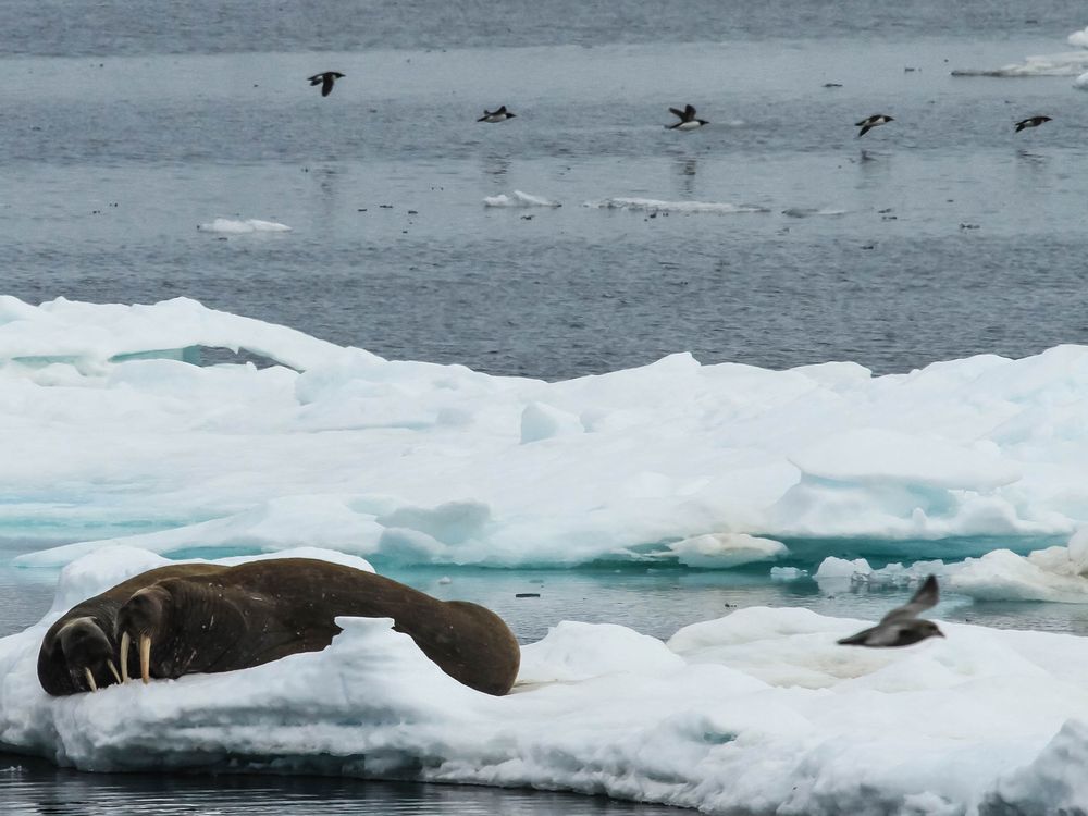 The quintessential Arctic scene with walrus on ice flows and birds flying in the background and foreground attest to the energy of Life even in harsh environment.