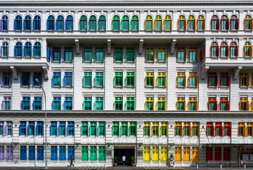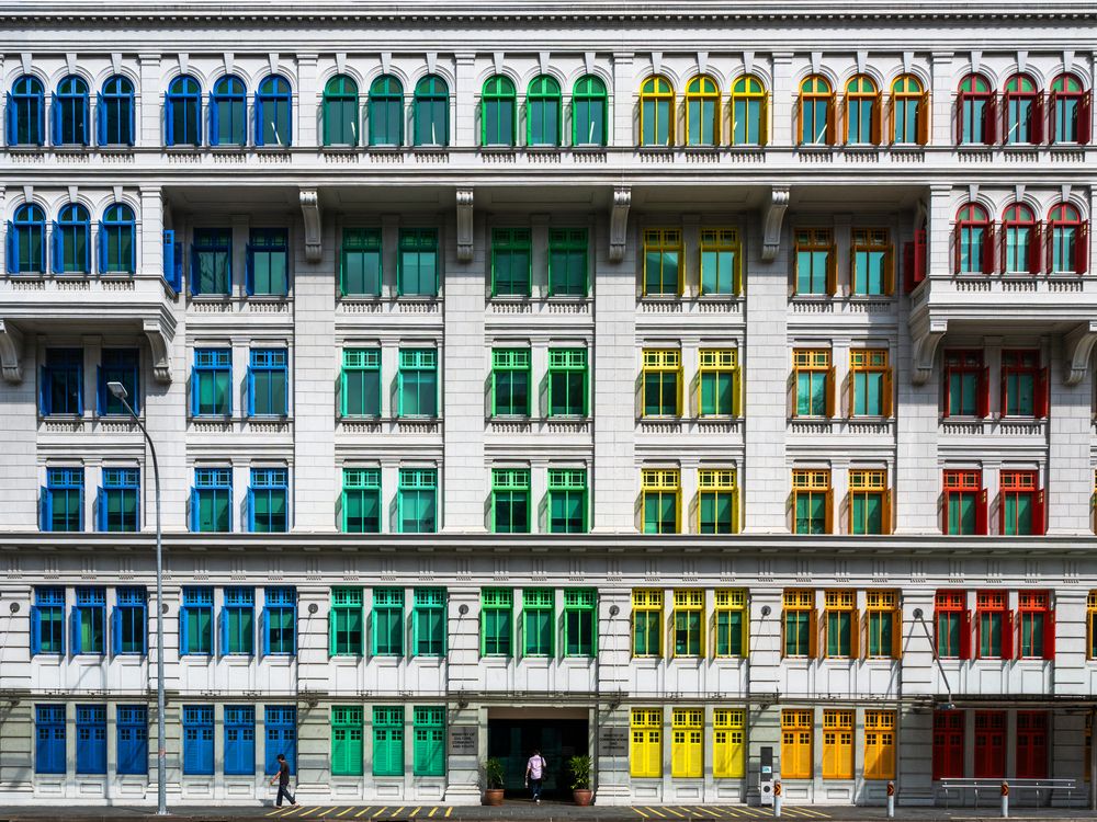 Singapore's historic Old Hill Street Police Station is famous for its more than 900 windows painted in the colors of the rainbow.