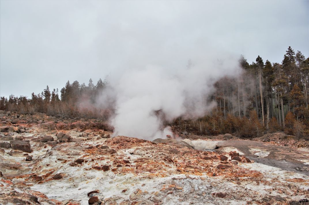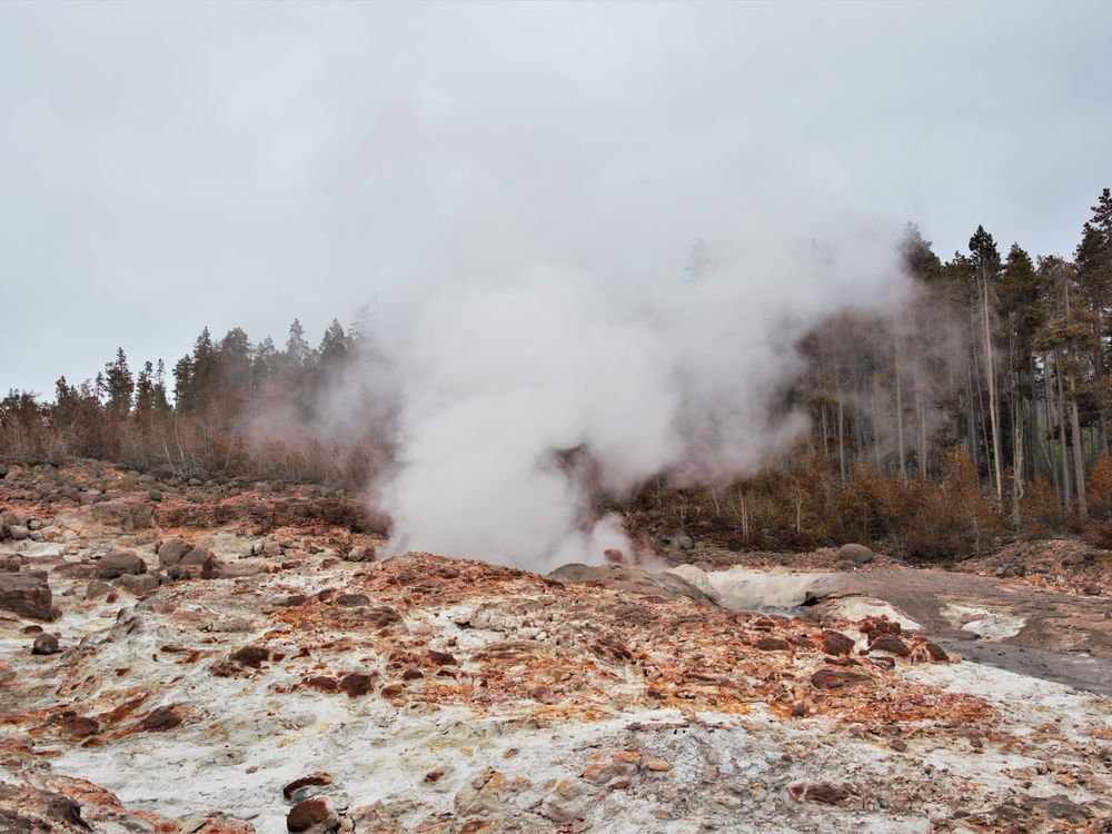 A cloudy and rainy day at Norris Geyser basin in Yellowstone NP. This was the only geyser at Norris with this kind of red tint to it.