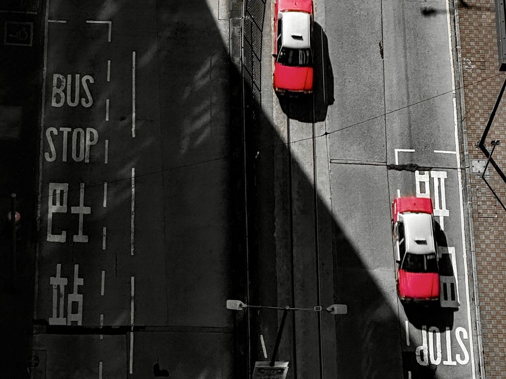 Three red taxis glide through the sunlight and shadow, forming a striking geometric rhythm on the streets of Hong Kong. In this moment, the city’s most iconic moving symbols become lines, shapes, and motion—turning everyday traffic into an abstract urban composition.