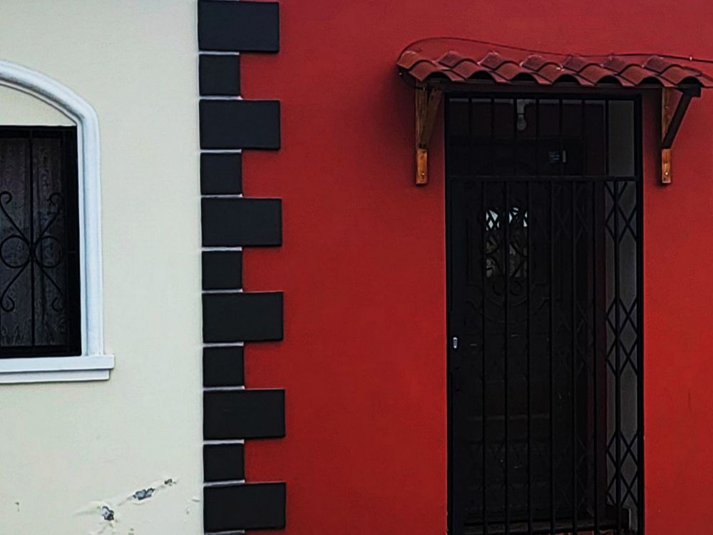 A striking composition founded on hard geometry and intense color captured in Cotacachi, Ecuador. This photograph showcases two adjacent structures: a smooth, cream-colored wall with a simple arched window, meeting a vibrant red wall detailed with stacked black bricks and a dark, grilled entrance. The intentional simplicity of the color blocks and the contrasting textures create a dynamic, modern portrait of the traditional architecture.