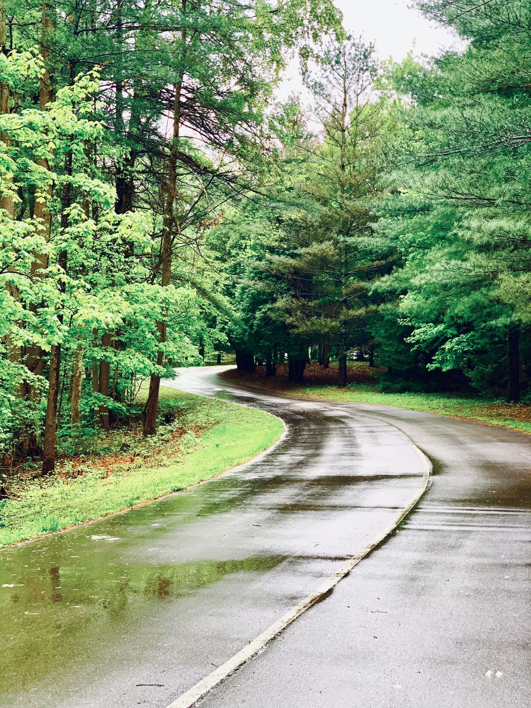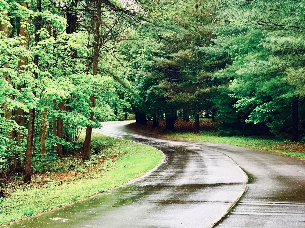 Spiral road after the rain. All the blemishes washed away in the rain, leaving all the leaves fresh and sharp, and the road glistening. An invitation for an epic journey like Bilbo’s.