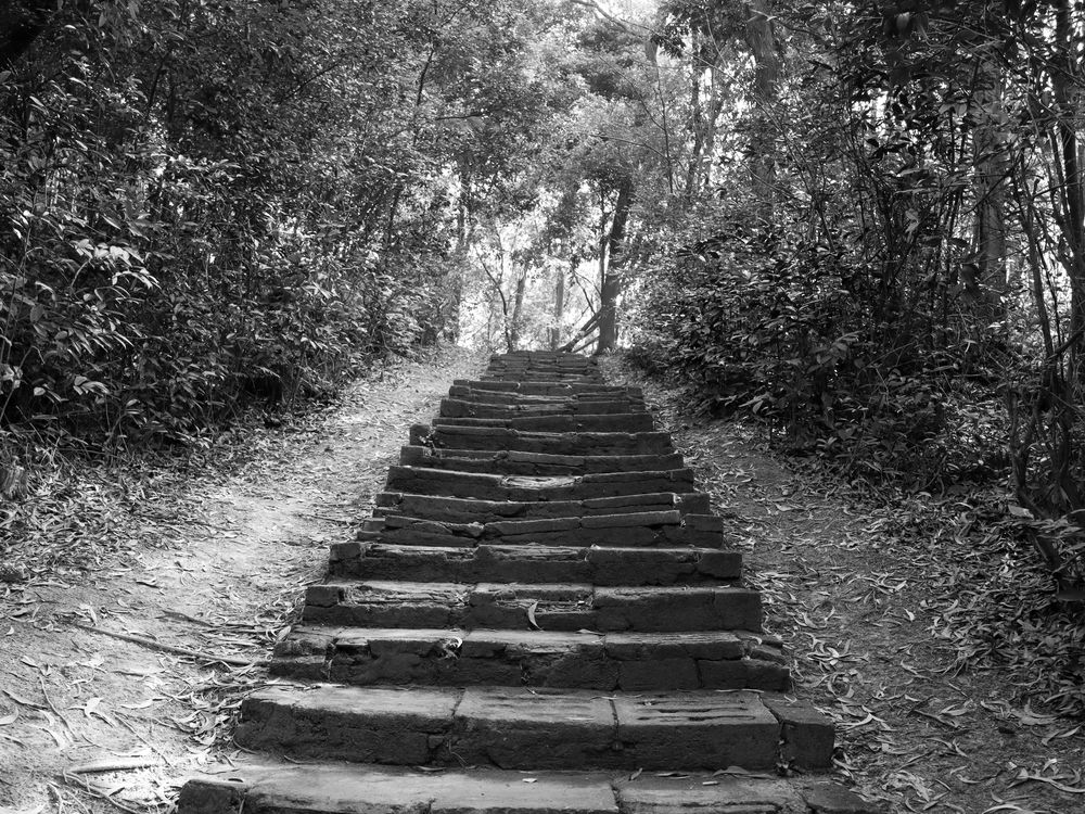 A long flight of stone steps glows under the sunlight on one side, while shadows linger on the other. Those who give up halfway will only see the darkness beside them. The destination lies ahead, bathed in light—what matters is whether one has the strength to keep going and earn the moment of standing in the sun.