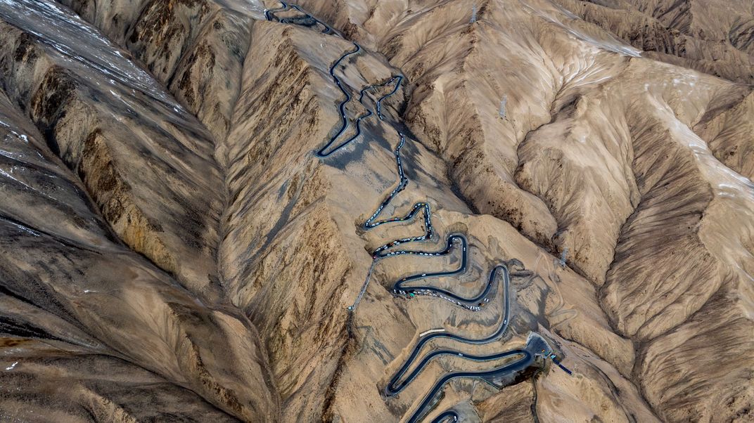 From above, a winding road weaves through yellow-brown mountains like a black ribbon curled around the rugged terrain. Ravines carve through the land, revealing striking textures that embody nature’s grandeur and ancient presence. The scene showcases not only the remarkable achievement of human engineering, but also the powerful visual impact and harmonious fusion between human creation and the natural world.