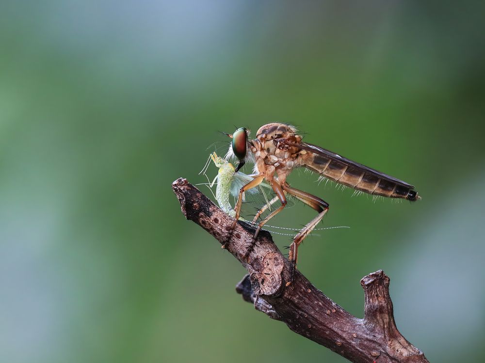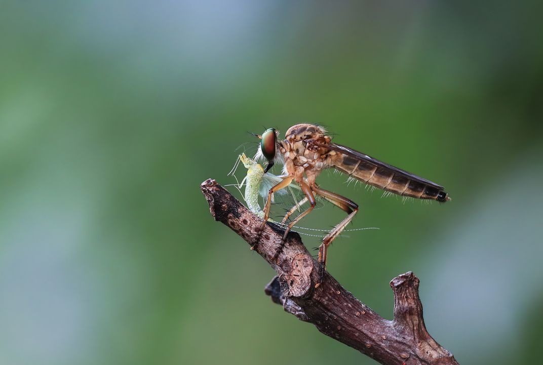 The robber fly caught a mayfly and stopped on a branch. It injected digestive juice into the mayfly for easy ingestion.